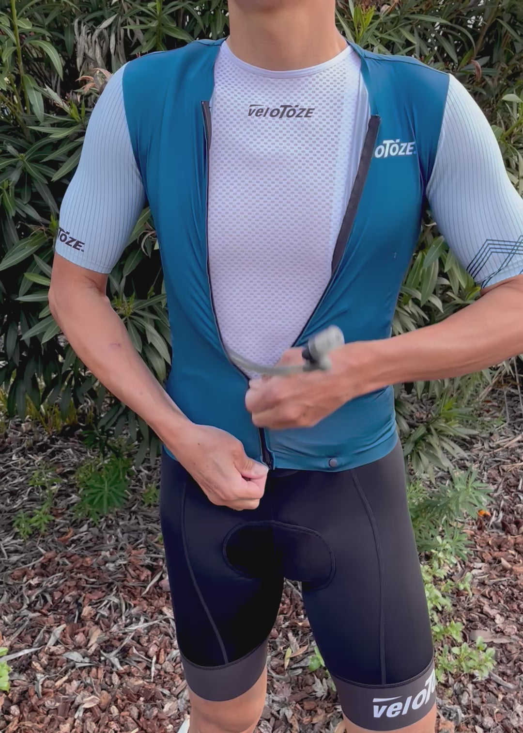 Discover the latest innovation from veloToze—the HydroVest, a groundbreaking solution that combines hydration, aerodynamics, and cooling during rides. This advanced base layer features a large pocket for a hydration reservoir, designed to be worn discreetly under your jersey. By eliminating the need for traditional external hydration packs, the HydroVest delivers a sleek, aerodynamic advantage to keep you riding faster and smarter.
